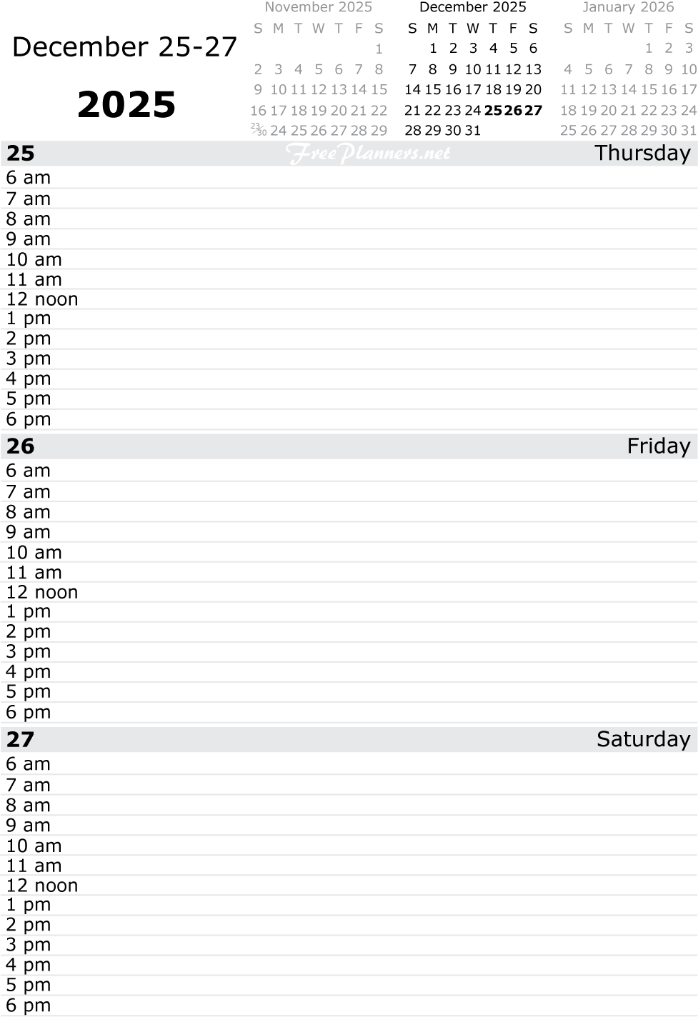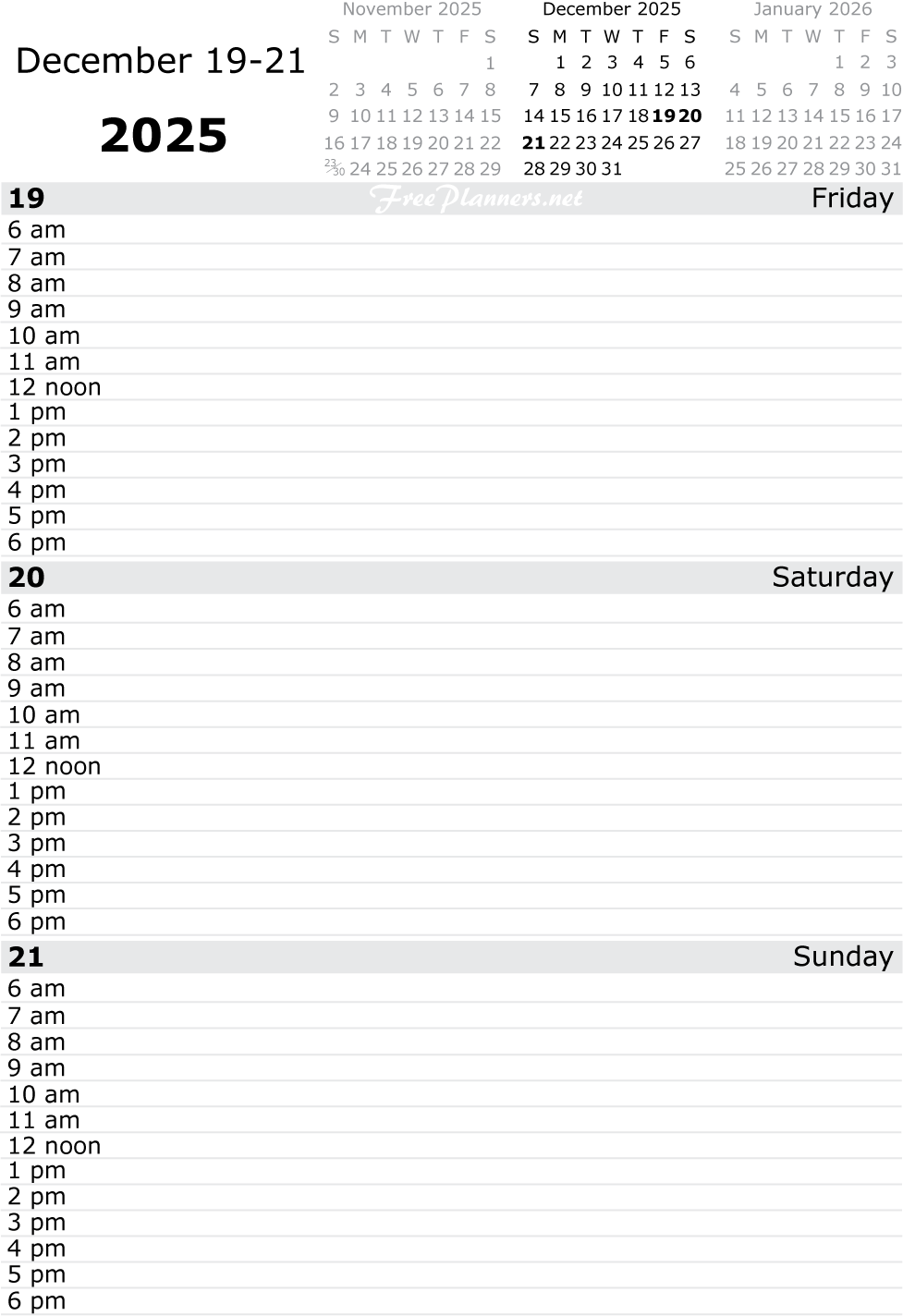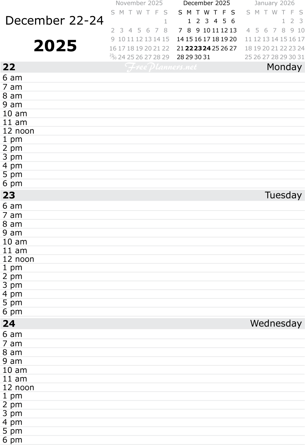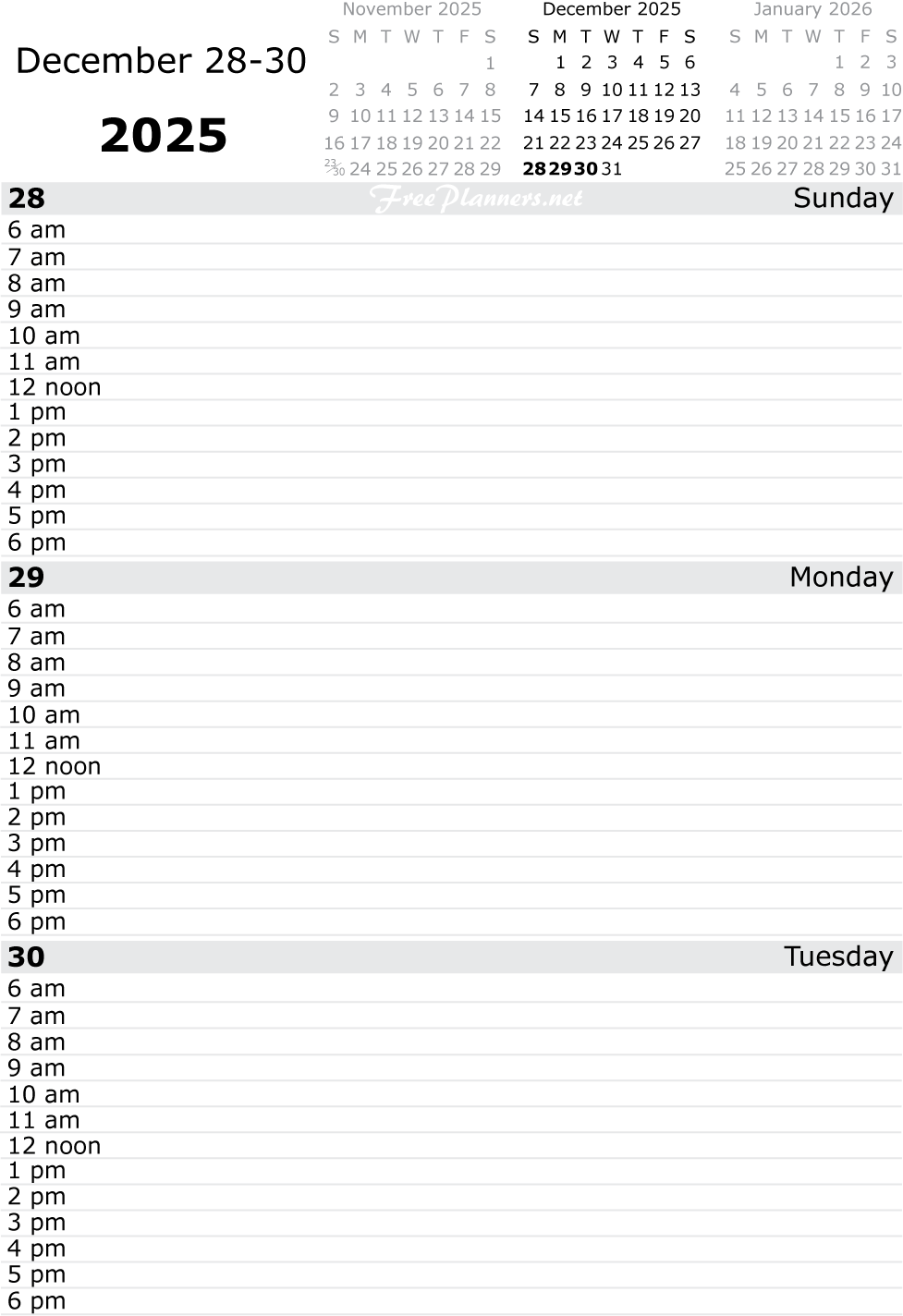 Each printable page of our dated daily planners includes three days. Each PDF file below contains all pages for the month listed.