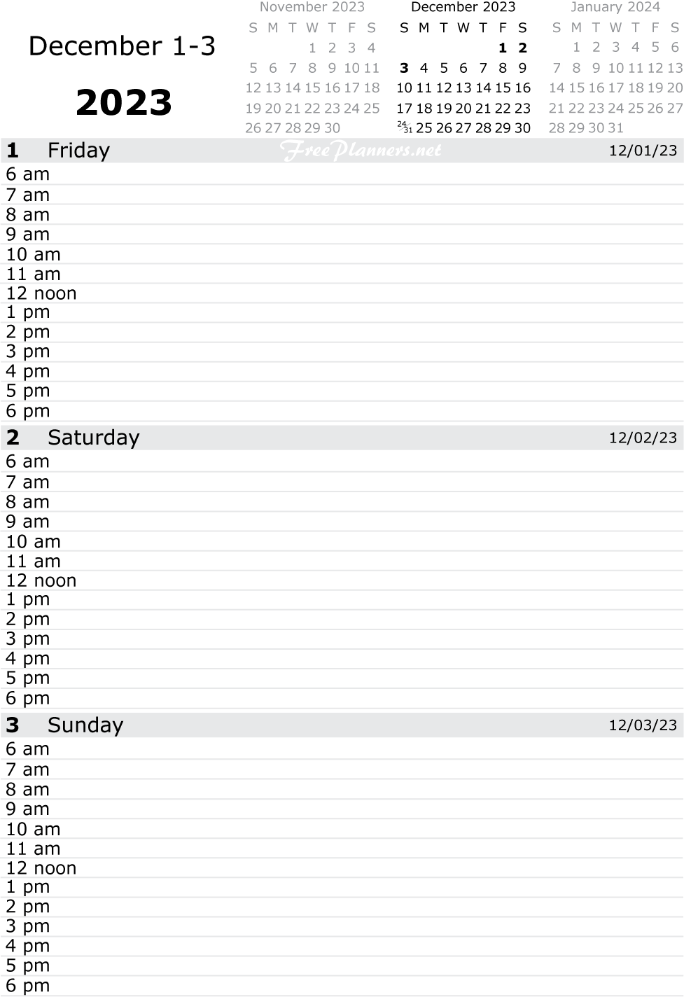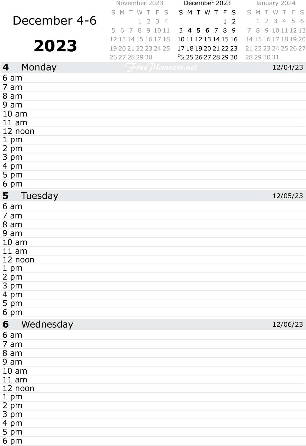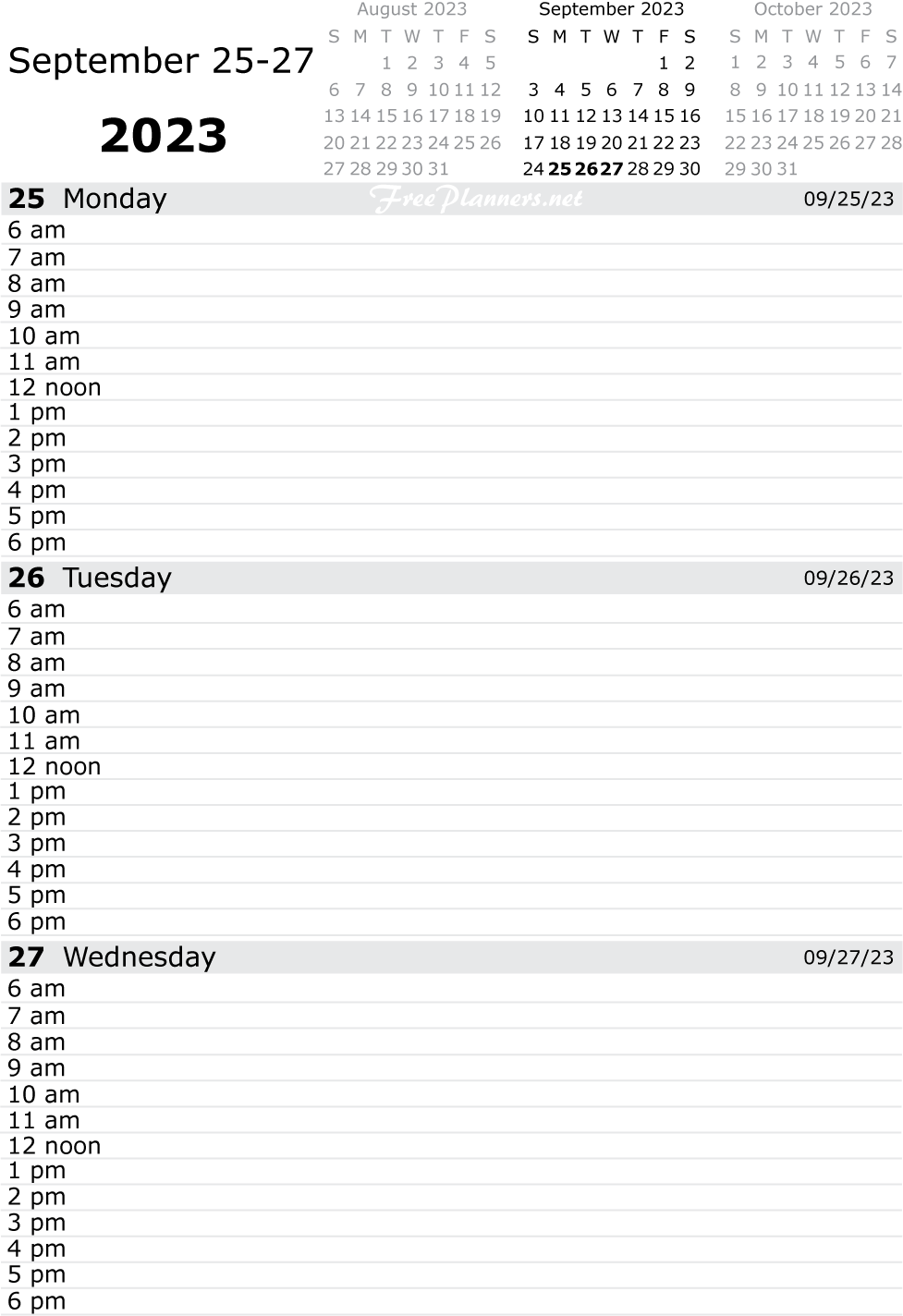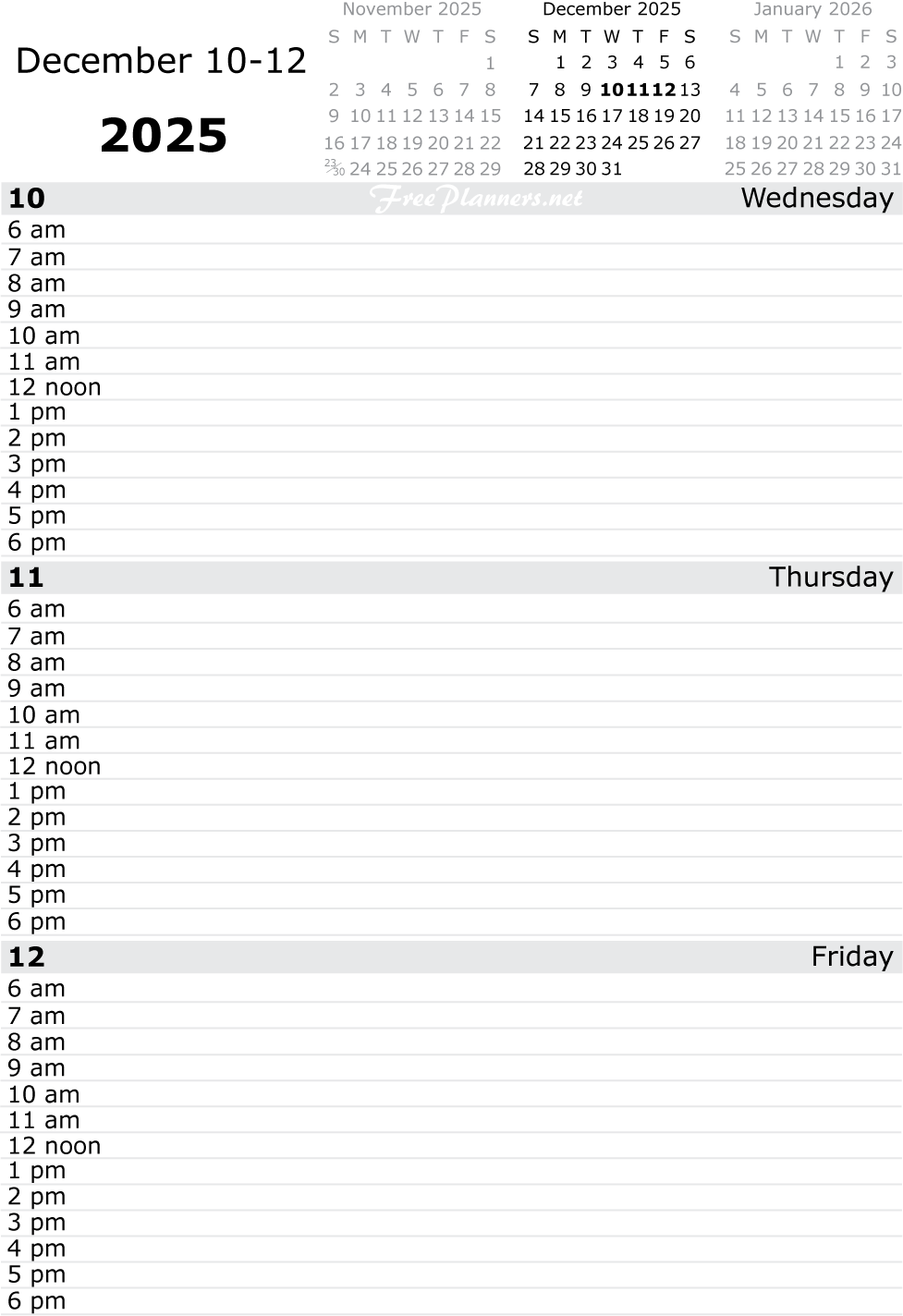 Each printable page of our dated daily planners includes three days. Each PDF file below contains all pages for the month listed.